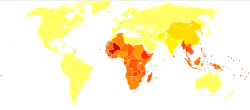 It is estimated that between 576 and 740 million individuals are infected with hookworm.[31][14] Of these infected individuals, about 80 million are severely affected.[19] The major cause of hookworm infection is N. americanus which is found in the Americas, sub-Saharan Africa, and Asia.[12] A. duodenale is found in more scattered focal environments, namely Europe and the Mediterranean. Most infected individuals are concentrated in sub-Saharan Africa and East Asia/the Pacific Islands with each region having estimates of 198 million and 149 million infected individuals, respectively. Other affected regions include: South Asia (50 million), Latin America and the Caribbean (50 million), South Asia (59 million), Middle East/North Africa (10 million).[14] A majority of these infected individuals live in poverty-stricken areas with poor sanitation. Hookworm infection is most concentrated among the world's poorest who live on less than $2 a day.[12]