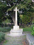 Close to the car park at the southern entrance onto Undercliffe Lane is a war memorial in the form of Cross of Sacrifice to those who died in the First and Second World Wars.[24] Behind the Cross of Sacrifice a low kerb memorial lists Commonwealth service personnel buried in the cemetery whose graves could not be marked by headstones. In all 135 Commonwealth service personnel – 92 from the First and 43 from the Second World War are buried here. Many of the former were burials from the Bradford War Hospital.[25]