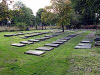 Most of the western half of the site is consecrated for Anglican burials while the eastern half is set aside for non-conformist burials such as Baptist, Methodist, and Quaker.[3][4] The Quaker graves are characterised by their identical horizontal ground level memorial stones.[3] The northern area of the cemetery was set aside for the un-baptised and those who had been excommunicated or committed suicide.[4][15] Communal graves known as 'company plots' are to be found on the southern side of the site where up to thirty coffins at a time were interred in one grave.[16]