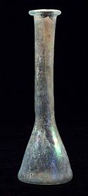 Thin blown-glass bottles began to appear in Cyprus after the middle of the 1st century BC.[21] The use of the new medium for unguentaria resulted in variations of form, including the thin, "test-tube" type. Glass unguentaria made in Thessaly, for example, often have a distinctive conical body, flared like the bell of a trumpet, or are squat and rounded with a very long neck; they come in a range of colors including aquamarine, pale green, and yellowish green, or may be colorless.[22] This shape was popular in the 2nd and 3rd centuries and is also characteristic of Thrace and Cyprus.[23]