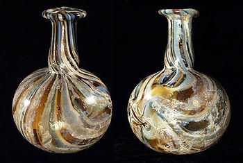 Glass unguentaria vary widely in quality and show a range of colors. The Judean desert caves, for instance, yielded unguentaria of aquamarine glass with large bubbles.[59] A striking example of a glass fusiform unguentarium from 1st-century Syria, a little over six inches tall, has a white spiral curling around the cerulean body. The base comes to an elongated, rounded point, and the lip is well-formed and prominent.[60] Techniques of "marbling," intended to emulate fashionably extravagant vessels made of sardonyx during the reigns of Augustus and Tiberius, were used for unguentaria as well as bowls.[61]