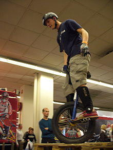 Unicycle trials is a form of unicycling which involves participants attempting to ride a unicycle over obstacles without any part of the rider touching the ground. [1] The obstacles traversed can be set up specifically for the purpose of unicycle trials, but are often walls, railings, ledges and other "street furniture" found in an urban environment. The sport is derived from (or at least inspired by) bike trials and motorcycle trials.