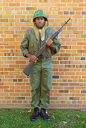 The variety worn depends on the environment: Deployed Marines wear whichever color is more appropriate to the climate and terrain.[20] The desert MCCUU is only worn in appropriate field environments[21] During the summer months, Marines in garrison will roll the sleeves of the woodland blouse, tightly folded up to the biceps, exposing the lighter inside layer, and forming a neat cuff to present a crisper appearance to the otherwise formless uniform. In the past, when Marines wore the same utilities as the Army and Air Force, this served to distinguish them from the other branches, who folded the sleeves in with the camo facing out. In Haiti, the practice earned them the nickname "whitesleeves".[22]