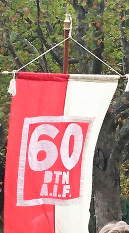 Glyde (1999)[12] does not describe writing on the battalion flags (only on the Artillery, Engineers and Medical flags), but writing designating the unit may have been displayed on some or all of the other flags.