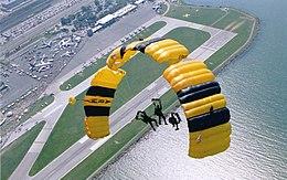 The STRAC is part of the United States Army Marketing and Engagement Brigade, headquartered at Fort Knox, Kentucky.[1] The parachute team is garrisoned at Fort Bragg, North Carolina, and has several dedicated facilities in the area. These facilities include an aviation support facility, a team headquarters facility, and a dedicated team drop zone. The team itself is composed of about 95 men and women and divided into several smaller task-oriented subunits, also called teams or sections. The support elements include an aviation section, a headquarters section, a media-relations section, and a supply section. The administrative and support personnel make up about half of the unit's end strength, and provide invaluable logistical support for the demonstrators and competitors as they perform their duties in the US and abroad. The team's operational elements include two demonstration teams, a four-way relative work team, a style and accuracy team, a tandem section, and most recently, a canopy swoop team.