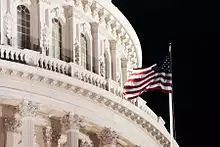On December 19, 1960, the Capitol was declared a National Historic Landmark by the National Park Service.[35] The building was ranked #6 in a 2007 survey conducted for the American Institute of Architects' "America's Favorite Architecture" list.[36] The Capitol draws heavily from other notable buildings, especially churches and landmarks in Europe, including the dome of St. Peter's Basilica in the Vatican and St. Paul's Cathedral in London.[37] On the roofs of the Senate and House Chambers are flagpoles that fly the U.S. flag when either is in session. On September 18, 1993, to commemorate the Capitol's bicentennial, the Masonic ritual cornerstone laying with George Washington was reenacted. Strom Thurmond was one of the Freemason politicians who took part in the ceremony.
