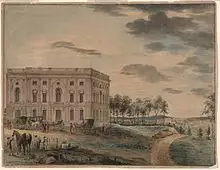 A late entry by amateur architect William Thornton was submitted on January 31, 1793, to much praise for its "Grandeur, Simplicity, and Beauty" by Washington, along with praise from Thomas Jefferson. Thornton was inspired by the east front of the Louvre, as well as the Paris Pantheon for the center portion of the design.[13][14] Thornton's design was officially approved in a letter, dated April 5, 1793, from Washington.[15] In an effort to console Hallet, the commissioners appointed him to review Thornton's plans, develop cost estimates, and serve as superintendent of construction. Hallet proceeded to pick apart and make drastic changes to Thornton's design, which he saw as costly to build and problematic.[16] In July 1793, Jefferson convened a five-member commission, bringing Hallet and Thornton together, along with James Hoban, to address problems with and revise Thornton's plan. Hallet suggested changes to the floor plan, which could be fitted within the exterior design by Thornton.[17][18] The revised plan was accepted, except that Jefferson and Washington insisted on an open recess in the center of the East front, which was part of Thornton's original plan.[19]
