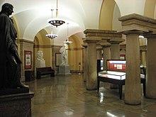 The central section of the Capitol comprising the rotunda and the crypt was not completed until 1827 under the oversight of Architect of the Capitol Charles Bulfinch.[4] However, plans to re-inter Washington in the Capitol fell apart when attempts were made to retrieve his body from Mount Vernon, the President's home, due to restrictions of Washington's will and refusal of the plantation's then owner, John Washington.[5]