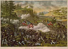 After Virginia's secession, a Unionist government in Wheeling asked 48 counties to vote on an ordinance to create a new state on October 24, 1861. A voter turnout of 34 percent approved the statehood bill (96 percent approving).[127] The inclusion of 24 secessionist counties[128] in the state and the ensuing guerrilla war engaged about 40,000 Federal troops for much of the war.[129][130] Congress admitted West Virginia to the Union on June 20, 1863. West Virginia provided about 20,000–22,000 soldiers to both the Confederacy and the Union.[131]