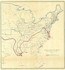 The small U.S. Navy of 1861 was rapidly enlarged to 6,000 officers and 45,000 men in 1865, with 671 vessels, having a tonnage of 510,396.[153][154] Its mission was to blockade Confederate ports, take control of the river system, defend against Confederate raiders on the high seas, and be ready for a possible war with the British Royal Navy.[155] Meanwhile, the main riverine war was fought in the West, where a series of major rivers gave access to the Confederate heartland. The U.S. Navy eventually gained control of the Red, Tennessee, Cumberland, Mississippi, and Ohio rivers. In the East, the Navy supplied and moved army forces about and occasionally shelled Confederate installations.