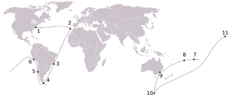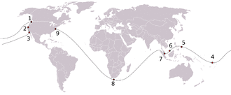 Wilkes arrived with the Porpoise and Oregon, while the Flying Fish was to rendezvous with the squadron in Honolulu.[28] The squadron surveyed San Francisco and its tributaries, and later produced a map of "Upper California".[29] The expedition then headed back out on October 31, arriving Honolulu on November 17, and departing on November 28.[30] They included a visit to Wake Island, and returned by way of the Philippines, Borneo, Singapore, Polynesia, and the Cape of Good Hope, reaching New York on June 10, 1842.