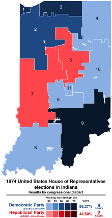 The 1974 United States House of Representatives elections were elections for the United States House of Representatives in 1974 that occurred in the wake of the Watergate scandal, which had forced President Richard Nixon to resign in favor of Gerald Ford. This scandal, along with high inflation,[1] allowed the Democrats to make large gains in the midterm elections, taking 49 seats from the Republicans and increasing their majority above the two-thirds mark. Altogether, there were 93 freshmen representatives in the 94th Congress when it convened on January 3, 1975 (76 of them Democrats). Those elected to office that year later came to be known collectively as "Watergate Babies."[2]