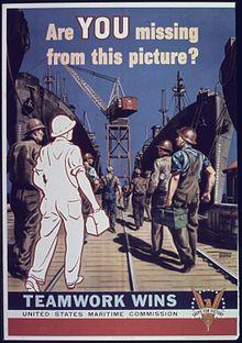 As a symbol of the rebirth of the U.S. Merchant Marine and Merchant Shipbuilding under the Merchant Marine Act, the first vessel contracted for was SS America, which was owned by the United States Line and operated in the passenger liner and cruise service during 1940-1. Upon the U.S. entry into World War II, America was requisitioned by the U.S. Navy and became USS West Point.[1] In the prewar years, several dozen other merchant ships were built for the Commission under its original 500 ship Long Range Shipbuilding Program but it wasn't until the late fall of 1940 the critical importance of the Commission to the defense of the lifeline to Great Britain and to the national mobilization for war became apparent when the beginnings of the Emergency Shipbuilding program were laid. Together, all the Maritime Commission's shipbuilding program became known as Ships for Victory and great pride was taken in it by the many thousands of ordinary citizens went to work in the shipyards and joined the ranks of the shipbuilding workforce.