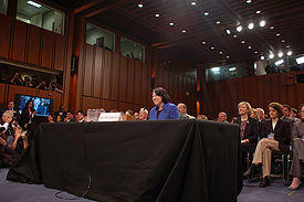 The Judiciary Committee's oversight of the DOJ includes all of the agencies under the DOJ's jurisdiction, such as the FBI. It also has oversight of the Department of Homeland Security (DHS). The committee considers presidential nominations for positions in the DOJ, the Office of National Drug Control Policy, the State Justice Institute, and certain positions in the Department of Commerce and DHS. It is also in charge of holding hearings and investigating judicial nominations to the Supreme Court, the U.S. court of appeals, the U.S. district courts, and the Court of International Trade.[1] The Standing Rules of the Senate confer jurisdiction to the Senate Judiciary Committee in certain areas, such as considering proposed constitutional amendments and legislation related to federal criminal law, human rights law, immigration, intellectual property, antitrust law, and internet privacy.[1][3]