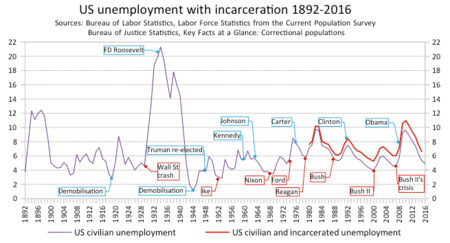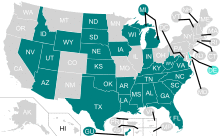 Since the Civil Rights Act of 1964, all employing entities and labor unions have a duty to treat employees equally, without discrimination based on "race, color, religion, sex, or national origin."[9] There are separate rules for sex discrimination in pay under the Equal Pay Act of 1963. Additional groups with "protected status" were added by the Age Discrimination in Employment Act of 1967 and the Americans with Disabilities Act of 1990. There is no federal law banning all sexual orientation or identity discrimination, but 22 states had passed laws by 2016. These equality laws generally prevent discrimination in hiring, terms of employment, and make discharge because of a protected characteristic unlawful. There is no federal law against unjust discharge, and most states also have no law with full protection against wrongful termination of employment.[10] Collective agreements made by labor unions and some individual contracts require people are only discharged for a "just cause". The Worker Adjustment and Retraining Notification Act of 1988 requires employing entities give 60 days notice if more than 50 or one third of the workforce may lose their jobs. Federal law has aimed to reach full employment through monetary policy and spending on infrastructure. Trade policy has attempted to put labor rights in international agreements, to ensure open markets in a global economy do not undermine fair and full employment.