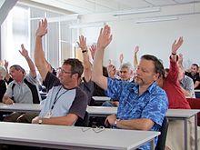While collective bargaining was stalled by US Supreme Court preemption policy, a dysfunctional National Labor Relations Board, and falling union membership rate since the Taft-Hartley Act of 1947, employees have demanded direct voting rights at work: for corporate boards of directors, and in work councils that bind management.[346] This has become an important complement to both strengthening collective bargaining, and securing the votes in labor's capital on pension boards, which buy and vote on corporate stocks, and control employers.[347] Labor law has increasingly converged with corporate law,[348] and in 2018 the first federal law, the Reward Work Act was proposed by three US senators to enable employees to vote for one third of the directors on boards of listed companies.[349] In 1919, under the Republican governor Calvin Coolidge, Massachusetts became the first state with a right for employees in manufacturing companies to have employee representatives on the board of directors, but only if corporate stockholders voluntarily agreed.[350] Also in 1919 both Procter & Gamble and the General Ice Delivery Company of Detroit had employee representation on boards.[351] Board representation for employees spread through the 1920s, many without requiring any employee stock ownership plan.[352] In the early 20th century, labor law theory split between those who advocated collective bargaining backed by strike action, those who advocated a greater role for binding arbitration,[353] and proponents of codetermination as "industrial democracy".[354] Today, these methods are seen as complements, not alternatives. A majority of countries in the Organisation for Economic Co-operation and Development have laws requiring direct participation rights.[355] In 1994, the Dunlop Commission on the Future of Worker-Management Relations: Final Report examined law reform to improve collective labor relations, and suggested minor amendments to encourage worker involvement.[356] Congressional division prevented federal reform, but labor unions and state legislatures have experimented.