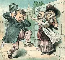 Commentator Jeff Jacoby notes that, "Not since George Washington had a candidate for president been so renowned for his rectitude."[10] In July the Republicans found a refutation buried in Cleveland's past. Aided by sermons from a minister named George H. Ball, they charged that Cleveland had fathered an illegitimate child while he was a lawyer in Buffalo. When confronted with the scandal, Cleveland immediately instructed his supporters to "Above all, tell the truth." Cleveland admitted to paying child support in 1874 to Maria Crofts Halpin, the woman who claimed he fathered her child, named Oscar Folsom Cleveland after Cleveland's friend and law partner, but asserted that the child's paternity was uncertain.[11] Shortly before election day, the Republican media published an affidavit from Halpin in which she stated that until she met Cleveland her "life was pure and spotless," and "there is not, and never was, a doubt as to the paternity of our child, and the attempt of Grover Cleveland, or his friends, to couple the name of Oscar Folsom, or any one else, with that boy, for that purpose is simply infamous and false."[12] In a supplemental affidavit, Halpin also implied Cleveland had raped her, hence the conception of their child.[12][13] Republican cartoonists across the land had a field day.[14][15][16][17][18][19]