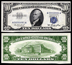 - 1933: The first small sized $10 silver certificates were issued with a blue seal and serial numbers. The obverse had a similar design style to the 1928 $1 Silver Certificates; however, phrasing on the $10 bill was different from the $1 bill. This issue, with the series date of 1933, was not widely released into general circulation. Surviving examples of these notes usually sell for $10,000 to $30,000 in the numismatic community depending on the condition of the paper.