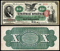- 1861: The first $10 bill was issued as a Demand Note with a small portrait of Abraham Lincoln on the left side of the obverse and an allegorical figure representing art on the right.