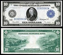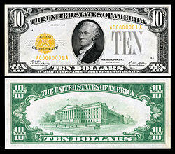 - 1929: Under the Series of 1928, all U.S. currency was changed to its current size. All variations of the $10 bill would carry the same portrait of Alexander Hamilton, same border design on the obverse, and the same reverse with a vignette of the U.S. Treasury building. The $10 bill was issued as a Federal Reserve Note with a green seal and serial numbers and as a gold certificate with a golden seal and serial numbers. The car parked outside of the Treasury Department building is based on a number of different cars manufactured at the time and was the creation of the Bureau designer who developed the artwork that served as a model for the engraving, because government agencies were prohibited from endorsing any specific manufacturer or product, according to a bureau of engraving and printing pamphlet.[4] The tiny building to the right rear of the treasury building is the American Security and Trust Company Building, which for some years advertised itself as "right on the money".[5][6]
