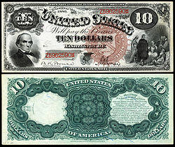 - 1869: A new $10 United States Note was issued with a portrait of Daniel Webster on the left and an allegorical representation of Pocahontas being presented to the Royal Court of England on the right side of the obverse. This note is nicknamed a "jackass note" because the eagle on the front looks like a donkey when the note is turned upside down.