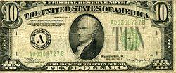 - 1933: As an emergency response to the Great Depression, additional money was pumped into the American economy through Federal Reserve Bank Notes. This was the only small-sized $10 bill that had a different border design on the obverse. The serial numbers and seal on it were brown.