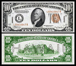 - 1942: Special World War II currency was issued. HAWAII was overprinted on the front and back of the $10 Federal Reserve Note, and the seal and serial numbers were changed to brown. This was done so that the currency could be declared worthless in case of Japanese invasion. A $10 Silver Certificate was printed with a yellow instead of blue treasury seal; these notes were given to U.S. troops in North Africa. These notes, too, could be declared worthless if seized by the enemy.