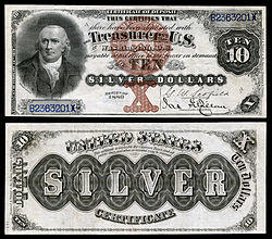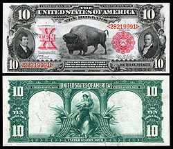 - 1890: Ten-dollar Treasury or "Coin Notes" were issued and given for government purchases of silver bullion from the silver mining industry. The note featured a portrait of General Philip Sheridan. The reverse featured an ornate design that took up almost the entire note.
