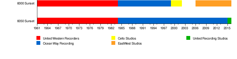 In 1984, United Western Recorders was renamed and succeeded by Ocean Way Recording. Starting in 1999, the complex was divided into two establishments: Ocean Way Recording (now United Recording Studios) at 6050 Sunset and Cello Studios (now EastWest Studios) at 6000 Sunset.