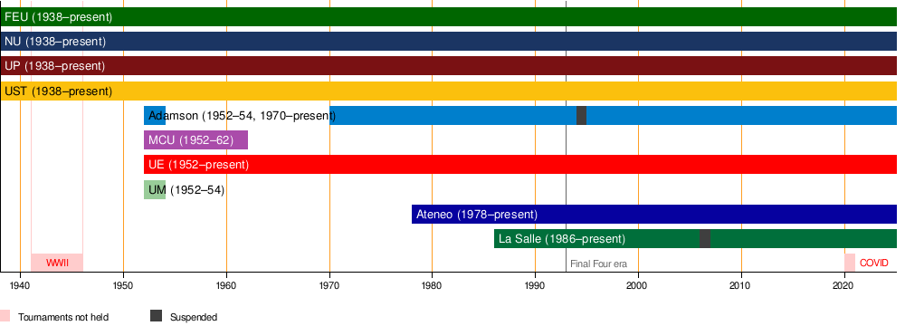 As of now, only four of the eight member universities participate in all 15 sports, namely the Ateneo de Manila University, the De La Salle University, the University of the Philippines, and the University of Santo Tomas.