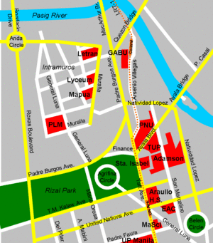 All institutions are located within the walled city of Intramuros. It also lies close in the northern tip of the Taft Ave. cluster.