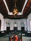 The Marinids, who were responsible for building many of the lavish madrasas around Fes, made various contributions to the mosque. In 1286 they restored and protected the 10th-century minaret, which had been made from poor-quality stone that was deteriorating, by covering it with whitewash.[5] At its southern foot they also built the Dar al-Muwaqqit, a chamber for the timekeeper of the mosque who was responsible for determining the precise times of prayer. The chamber was equipped with astrolabes and other scientific equipment of the era in order to aid in this task. Notably, a number of water clocks were built for it, the last of which, built on the orders of Sultan Abu Salim Ali II (ruled 1359-1361), is still partly preserved today.[56][61][62] The galleries around the nearby courtyard (sahn) were also rebuilt or repaired in 1283 and 1296–97, while at the entrance from the courtyard to the prayer hall (leading to the central nave of the mihrab), a decorative wooden screen, called the anaza, was installed in 1289 and acted as a symbolic "outdoor" or "summer" mihrab for prayers in the courtyard.[5] At the central outer entrance to the courtyard from the north, the gate called Bab al-Ward ("Gate of the Rose"), a decorative cupola and dome was installed over its vestibule in 1337, still visible today (with minor restorations).[5] A number of ornate metal chandeliers hanging in the mosque's prayer hall also date from the Marinid era. Three of them were made from church bells which Marinid craftsmen used as a base onto which they grafted ornate copper fittings. The largest of them, installed in the mosque in 1337, was a bell brought back from Gibraltar by the son of Sultan Abu al-Hasan, Abu Malik, after its reconquest from Spanish forces in 1333.[5]