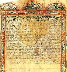 The Qarawiyyin also compiled a large selection of manuscripts that were kept at a library founded by the Marinid Sultan Abu Inan Faris in 1349.[5][39] The collection housed numerous works from the Maghreb, al-Andalus, and the Middle East.[40] Part of the collection was gathered decades earlier by Sultan Abu Yusuf Ya'qub (ruled 1258–1286) who persuaded Sancho IV of Castile to hand over a number of works from the libraries of Seville, Cordoba, Almeria, Granada, and Malaga in al-Andalus/Spain. Abu Yusuf initially housed these in the nearby Saffarin Madrasa (which he had recently built), but later moved them to the Qarawiyyin.[40] Among the most precious manuscripts currently housed in the library are volumes from the famous Al-Muwatta of Malik written on gazelle parchment,[41] a copy of the Sirat of Ibn Ishaq,[41] a 9th-century Qur'an manuscript (also written on gazelle parchment),[34]:148 a copy of the Qur'an given by Sultan Ahmad al-Mansur in 1602,[41] a copy of Ibn Rushd's Al-Bayan Wa-al-Tahsil wa-al-Tawjih (a commentary on Maliki fiqh) dating from 1320,[42][34]:143 and the original copy of Ibn Khaldun's book Al-'Ibar (including the Muqaddimah) gifted by the author in 1396.[41][37] Also recently rediscovered in the library is a ijazah certificate, written on deer parchment, which some scholars claim to be the oldest surviving predecessor of a Medical Doctorate degree, issued to a man called Abdellah Ben Saleh Al Koutami in 1207 CE under the authority of three other doctors and in the presence of the chief qadi (judge) of the city and two other witnesses.[43][44] The library was managed by a qayim or "conservator" who oversaw the maintenance of its collection.[34]:143[40] By 1613 one conservator estimated the library's collection at 32,000 volumes.[40]