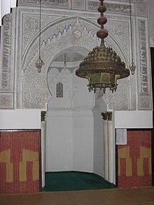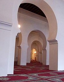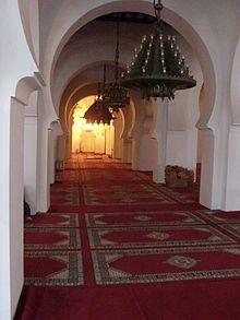 The interior hypostyle prayer hall takes up most of the mosque's area. Like the interior of most traditional mosques in Moroccan architecture, it is a relatively austere space, with mostly plain walls, wooden roofs, and rows upon rows of arches. The main area, south of the courtyard, is a vast space divided into ten transverse aisles by rows of arches running parallel to the southern wall.[5] The southern wall of this hall also marks the qibla or direction of prayer for Muslim worshipers. The central axis of the prayer hall, perpendicular to the qibla wall, is marked by a central "nave" running between two extra lines of arches along this axis, perpendicular to the other arches.[5] This nave leads towards the mihrab: a niche in the qibla wall which symbolizes the direction of prayer, and in front of which the imam usually leads prayers and delivers sermons. This overall layout (a hypostyle hall with a central nave emphasized against the others) is a familiar layout for North African mosques generally.[5][64]