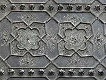 The Qarawiyyin's exterior does not generally present a monumental appearance and is integrated with the dense urban fabric around it. By one count there are 18 separate gates and entrances distributed around its perimeter.[34] The gates vary from small rectangular doorways to enormous horseshoe arches with huge doors preceded by wooden roofs covering the street in front of them.[5] While the doors are generally made of wood, some of the gates have extensive ornate bronze overlays crafted during the Almoravid period.[5] The most ornate and best-preserved examples include the doors of the principal northern gate, Bab al-Ward (which opens onto the courtyard), the western gate called Bab Sbitriyyin (whose current doors, however, are replicas replacing the originals now kept by the Dar Batha Museum[56]), and the southwestern gate Bab al-Gna'iz which leads to the Jama' al-Gna'iz or Funeral Mosque.[5][57] The much more monumental northwestern gates of the mosque, Bab al-Shama'in (or Bab Chemaine) and Bab al-Maqsura, also have heavy bronze fittings, including some ornate knockers, which date from the Almoravid period.[5]