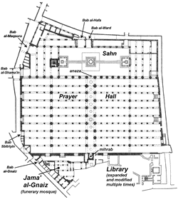 The mosque was founded in the 9th century but its present form is the result of a long historical evolution over the course of more than 1,000 years. The original building, whose traces are preserved in the layout of the current mosque, occupied much of what is today the central area of the prayer hall, south of the courtyard.[5][56]:119 It had a rectangular floor plan measuring 36 by 32 metres, covering an area of 1520 square metres, and was composed of a prayer hall with four transverse aisles running roughly east–west, parallel to the southern qibla wall.[5][34]:135 It probably also had a courtyard of relatively small size, and the first minaret, also of small size, reportedly stood on the location now occupied by the wooden anaza (at the central entrance to the prayer hall from the courtyard).[5] Water for the mosque was initially provided by a well dug within the mosque's precinct.[5]