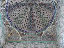 At the western and eastern ends of the courtyard stand two ornate Saadian pavilions each sheltering another fountain. The pavilions have pyramidal domes and emulate the pavilions in the Court of Lions in the Alhambra (Spain).[5] They are decorated with carved wood and stucco, mosaic-tiled walls, and marble columns.[63] Behind these pavilions are extensions of the main prayer hall divided into four naves by rows of arches.[5] The gallery and arched hall on the northeastern sides of the courtyard are a prayer space reserved for women.[5]