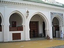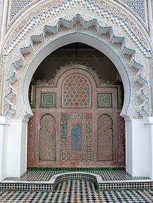 The courtyard (sahn) is rectangular, surrounded by the prayer hall on three sides and by a gallery to the north. The floor is paved with typical Moroccan mosaic tiles (zellij) and at the center is a fountain.[64] From outside the mosque, the courtyard is accessed by the main northern gate, called Bab al-Ward, whose vestibule is covered by a Marinid-era white dome which is fluted on the outside and covered in painted and carved stucco on the inside.[5] Opposite this gate, situated on the mihrab axis, is the central entrance to the interior prayer hall, guarded by a carved and painted wooden screen called the anaza which also acted as a symbolic "outdoor" or "summer" mihrab for prayers taking place in the courtyard.[5] (These features are visible to visitors standing outside the gate.) Both this entrance to the prayer hall and the outer gate across from it have facades decorated with carved and painted stucco.[5]