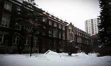 Of the 45 students in the University's first cohort in 1908, seven were women.[16] These original seven formed a type of sorority, called Seven Independent Spinsters, or S.I.S., with the intention of supporting the women's social and academic needs.[17] In 1909, the group changed its name to the Wuaneita Club, and then to the Wuaneita Society in 1910.[17] All female students at the University were initiated into the Society every fall.[17] The group heavily appropriated from Cree culture: the name Wuaneita is a rough equivalent to the Cree word meaning "kind-hearted"; their initiation ceremonies featured costumes with feathers and headdresses; the society president was called the "Big Chief": and the motto of the group was "payuk uche kukeyow, mena kukeyow uche payuk,” a rough translation into Cree of "all for one, one for all" that is still engraved above the outer doors of Pembina Hall on main campus.[18][16] For much of the Wuaneita Society's existence, as they were coopting First Nations traditions and ceremonies, the Potlatch ban was in effect in Canada.[16] The group wound down in 1973 once the population of female students on campus had outgrown the need for a supportive society.[16]