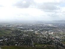 UCR's main campus sits at an elevation of 1,100 ft (340 m) to 1,450 ft (440 m) near Box Springs Mountain, 3 miles (5 km) east of downtown Riverside, and comprises 1,112 acres (450 ha) divided into eastern and western areas by the State Route 60 freeway.[36][42]