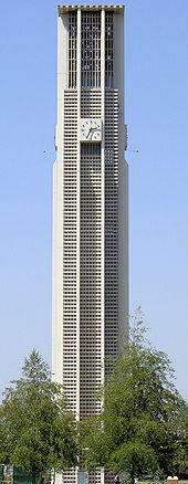 Further major construction largely ceased on the site until the groundbreaking for the College of Humanities Arts and Social Sciences (CHASS) in April 1951. A group of five buildings designed by different architects in a decidedly more Modern style were completed by 1954: the Rivera Library, Webber Hall, Geology Building, Physical Education Building and Watkins Hall. After the Regents declared UCR a "general campus" of the UC system in 1958, many new buildings and additions were laid out over the following decade. Following an east–west axis, new student residence halls and athletic facilities were developed along the southeastern quadrant of the main campus, while academic and research facilities were built along the central campus area closer to the freeway.[36] The Bell Tower, one of only five carillons in California, was built in this period. Designed by A. Quincy Jones, the tower is 161 ft (49 m) tall and contains 48 bells, each weighing from 28 pounds (13 kg) to 5,091 pounds (2,309 kg), covering four chromatic octaves.[43]