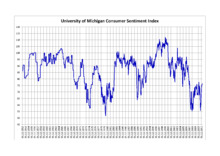 The University of Michigan Consumer Sentiment Index is a consumer confidence index published monthly by the University of Michigan. The index is normalized to have a value of 100 in December 1966.[1] Each month at least 500 telephone interviews are conducted of a contiguous United States sample. Fifty core questions are asked.[2]