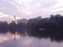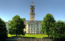 University Park Campus, to the west of Nottingham city centre, is the 330-acre (1.3 km2) main campus of the University of Nottingham. Set around its lake and clock-tower and with extensive parkland greenery,[17][18] University Park has won numerous awards for its architecture and landscaping, and has been named the greenest campus in the country in a Green Flag Award.[19]