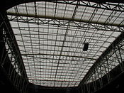 The roof is made out of translucent Birdair fabric and opens in 12 minutes. It is the first retractable roof ever built on an incline.