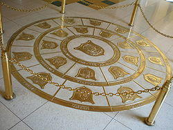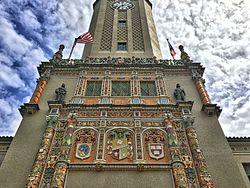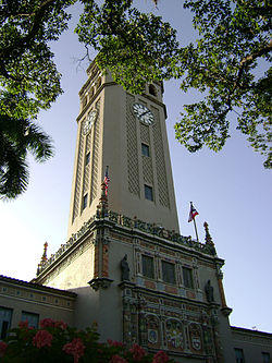 In 1936, architect Rafael Carmoega, working under the Puerto Rico Reconstruction Administration (PRRA), designed the distinctive University of Puerto Rico clock tower based on the 1924 Parsons Plan.[9] The iconic university clock tower was built in 1937 and christened as the Franklin Delano Roosevelt tower, in honor of the president and his interest in the building of the university. La Torre (as The Tower is nicknamed in Spanish) is located at the entrance of the Román Baldorioty de Castro Building.[3] Also at the entrance of the Tower, the coats of arms of the nations of the Americas appear in a bronze circle, as a symbol of Panamerican Union.[10]