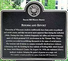 On August 24, 1970, near 3:40 am, a bomb exploded next to Sterling Hall, aimed at destroying the Army Math Research Center.[30] Despite the late hour, a post doctoral physics researcher, Robert Fassnacht, was in the lab and was killed in the explosion. The physics department was severely damaged, while the intended target, the AMRC, was scarcely affected. Karleton Armstrong, Dwight Armstrong, and David Fine were found responsible for the blast. Leo Burt was identified as a suspect, but was never apprehended or tried.[31]