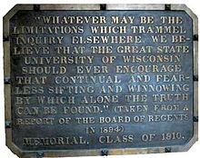 - 1894 State Board of Regents rejected an effort to purge Professor Richard T. Ely for supporting striking printers, issuing the famous "sifting and winnowing" manifesto in defense of academic freedom, later described as "part of Wisconsin's Magna Carta"[36]