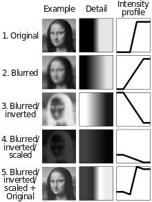 For the photographic darkroom process, a large-format glass plate negative is contact-copied onto a low-contrast film or plate to create a positive image. However, the positive copy is made with the copy material in contact with the back of the original, rather than emulsion-to-emulsion, so it is blurred. After processing this blurred positive is replaced in contact with the back of the original negative. When light is passed through both negative and in-register positive (in an enlarger, for example), the positive partially cancels some of the information in the negative.