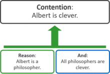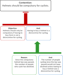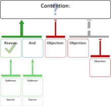 In informal logic and philosophy, an argument map or argument diagram is a visual representation of the structure of an argument. An argument map typically includes the key components of the argument, traditionally called the conclusion and the premises, also called contention and reasons.[1] Argument maps can also show co-premises, objections, counterarguments, rebuttals, and lemmas. There are different styles of argument map but they are often functionally equivalent and represent an argument's individual claims and the relationships between them.