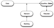 Stephen Toulmin, in his groundbreaking and influential 1958 book The Uses of Argument,[20] identified several elements to an argument which have been generalized. The Toulmin diagram is widely used in educational critical teaching.[21][22] Whilst Toulmin eventually had a significant impact on the development of informal logic he had little initial impact and the Beardsley approach to diagramming arguments along with its later developments became the standard approach in this field. Toulmin introduced something that was missing from Beardsley's approach. In Beardsley, "arrows link reasons and conclusions (but) no support is given to the implication itself between them. There is no theory, in other words, of inference distinguished from logical deduction, the passage is always deemed not controversial and not subject to support and evaluation".[23] Toulmin introduced the concept of warrant which "can be considered as representing the reasons behind the inference, the backing that authorizes the link".[24]